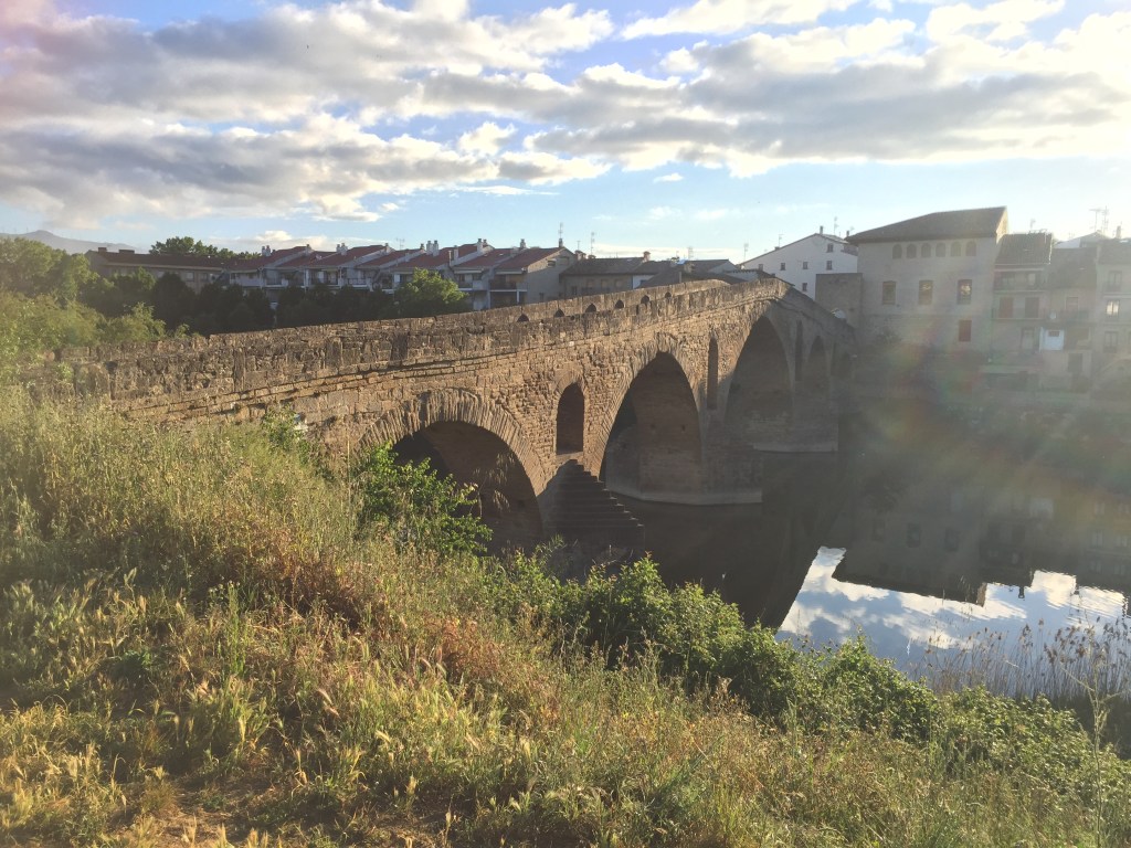 The last few days on the road have been marked with changing vegetation – endless wheat fields (I guess they need the wheat for all the delicious bocadillos I cant get enough of!), fields of peas (sweet and delicious!), olive groves and vines. Walking has been difficult at times, at others easy. I’m tired and sore by the end of a day. My feet ache, but thankfully no blisters. My shoes are still ugly. I’m beginning to realise just how much the Camino is a metaphor for life. Inspiration has been plentiful. We walked the medieval bridge at Puenta la Reina. If you close your eyes I swear you can hear the pilgrims who have crossed that bridge for thousands of years, and the Roman chariots with the clip clopping of horses hooves. If you’re ever here, try it. You’ll hear it.