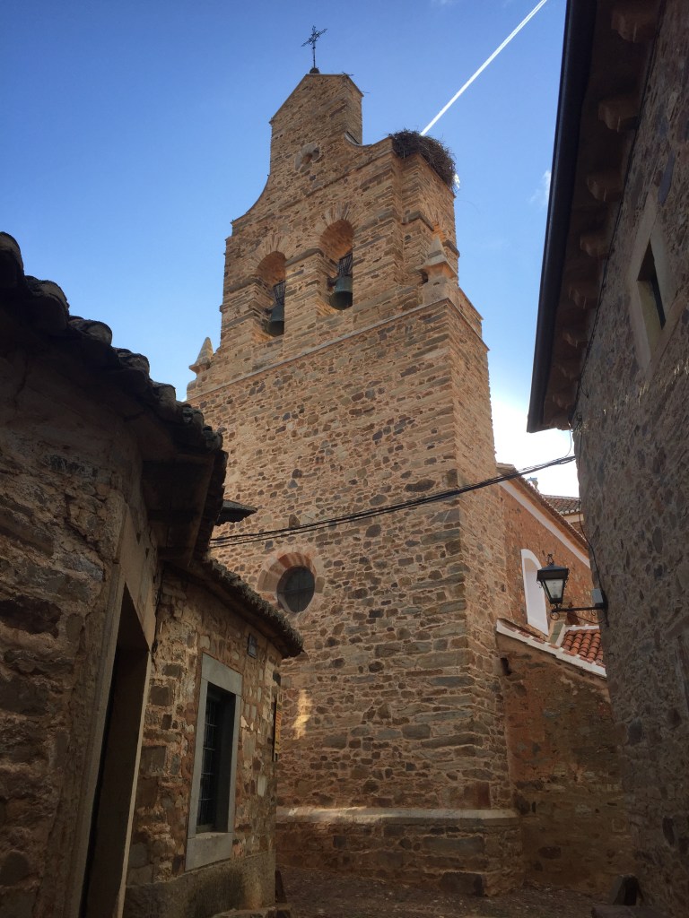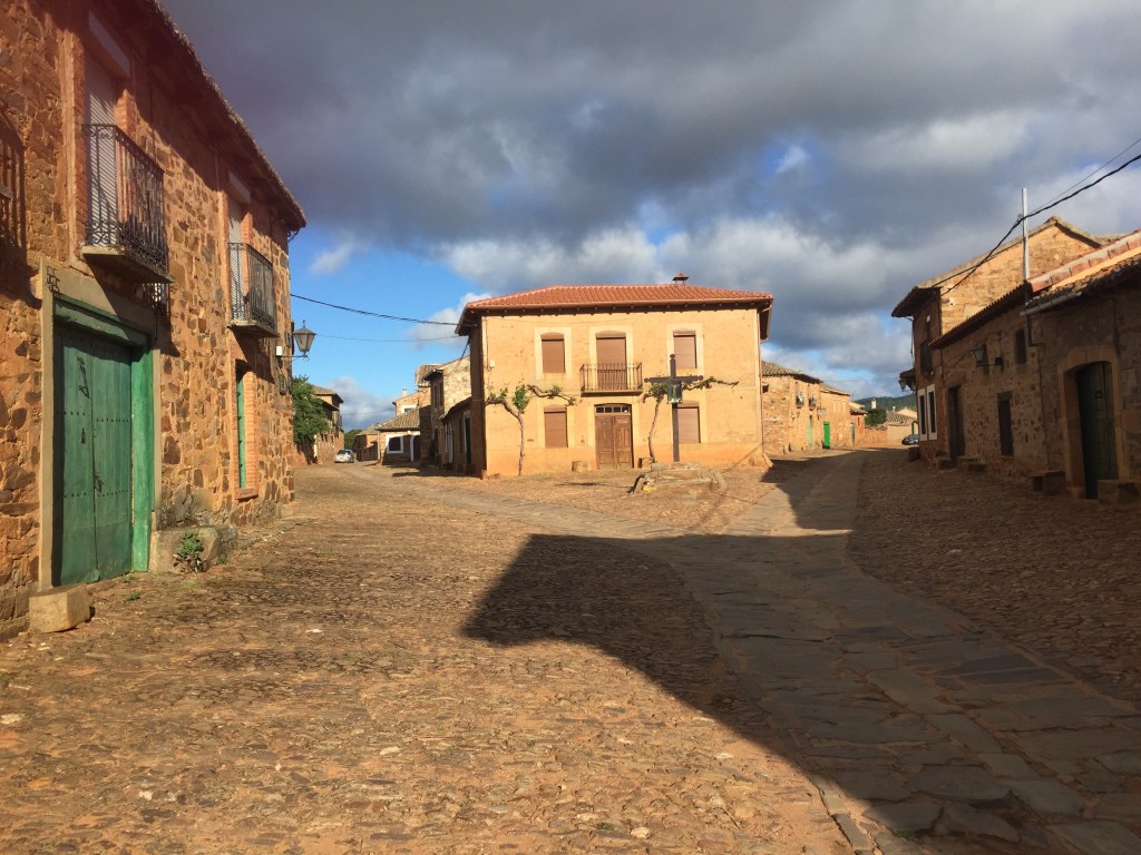 The walk from Astorga to Molinaseca was spectacular. Where do I begin? Well maybe in the beautiful township of Castrillo de los Polvazares. On the alternative route from Astorga we visited this quaint little village. First curious thing I noticed was the lack of people. Maybe not so unusual for 8.00am in Spain! So, walking through the village I met a beautiful spaniel who just knew I needed a cuddle. 🙂 I sat to admire the church (which was closed, of course…) – check out the stork nest on the right…