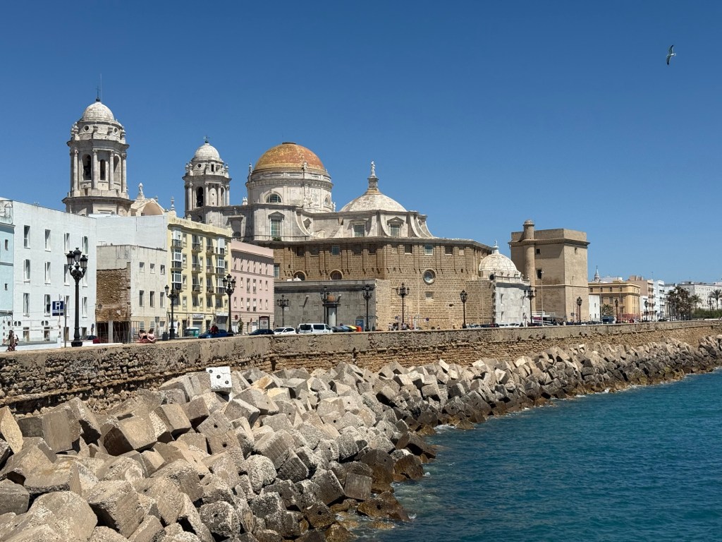 Cádiz is a beautiful small city in the south of Spain. It’s the oldest city in Western Europe, founded by the Phoenicians around 1100BC. It was a significant port in the Roman Empire and there is a huge Roman amphitheater that was discovered here in the 1980s. Today Cadiz is a popular port for cruise ships, is popular with Spanish tourists for its beaches, and has a thriving university community.